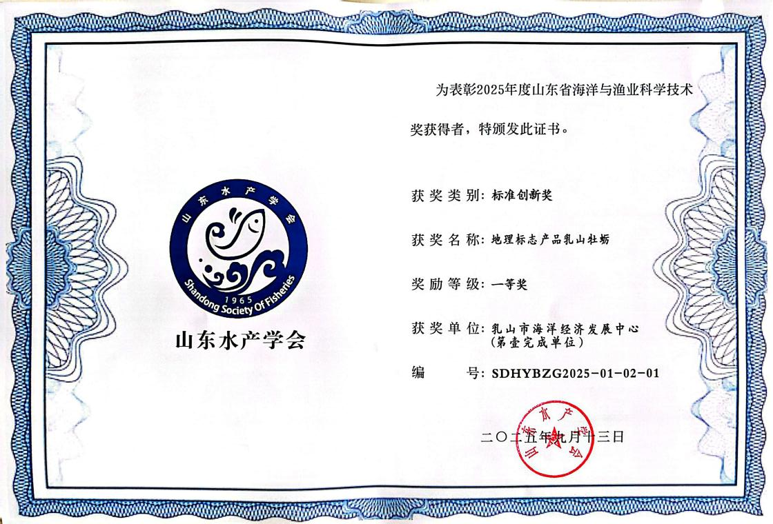 近日,由省贝类产业技术体系威海综合试验站(乳山市海洋经济发展中心)牵头制定的《地理标志产品 乳山牡蛎》地方标准荣获“山东省海洋与渔业科学技术奖(标准创新类)”一等奖。